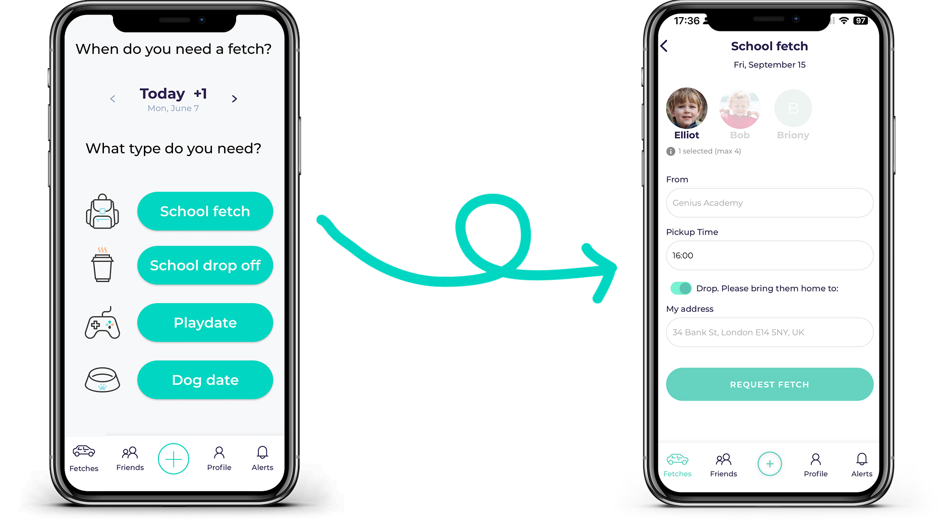 'School fetch' and 'school drop off' are completely free, but require your child's school to be using Fetching. 'Playdates' are 'Dog dates' are part of our subscription package.